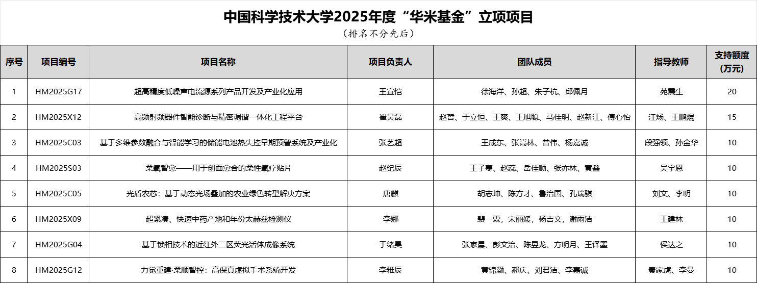 根据工作安排,qiutantiyu.com2025年度“华米基金”经过项目申报、资格审查、尽职调查、投票表决、校内公示、预立项等环节,确定“超高精度低噪声电流源系列产品开发及产业化应用”等8个项目(详见附件)为2025年度“华米基金”立项项目,予以资助,特此通知。