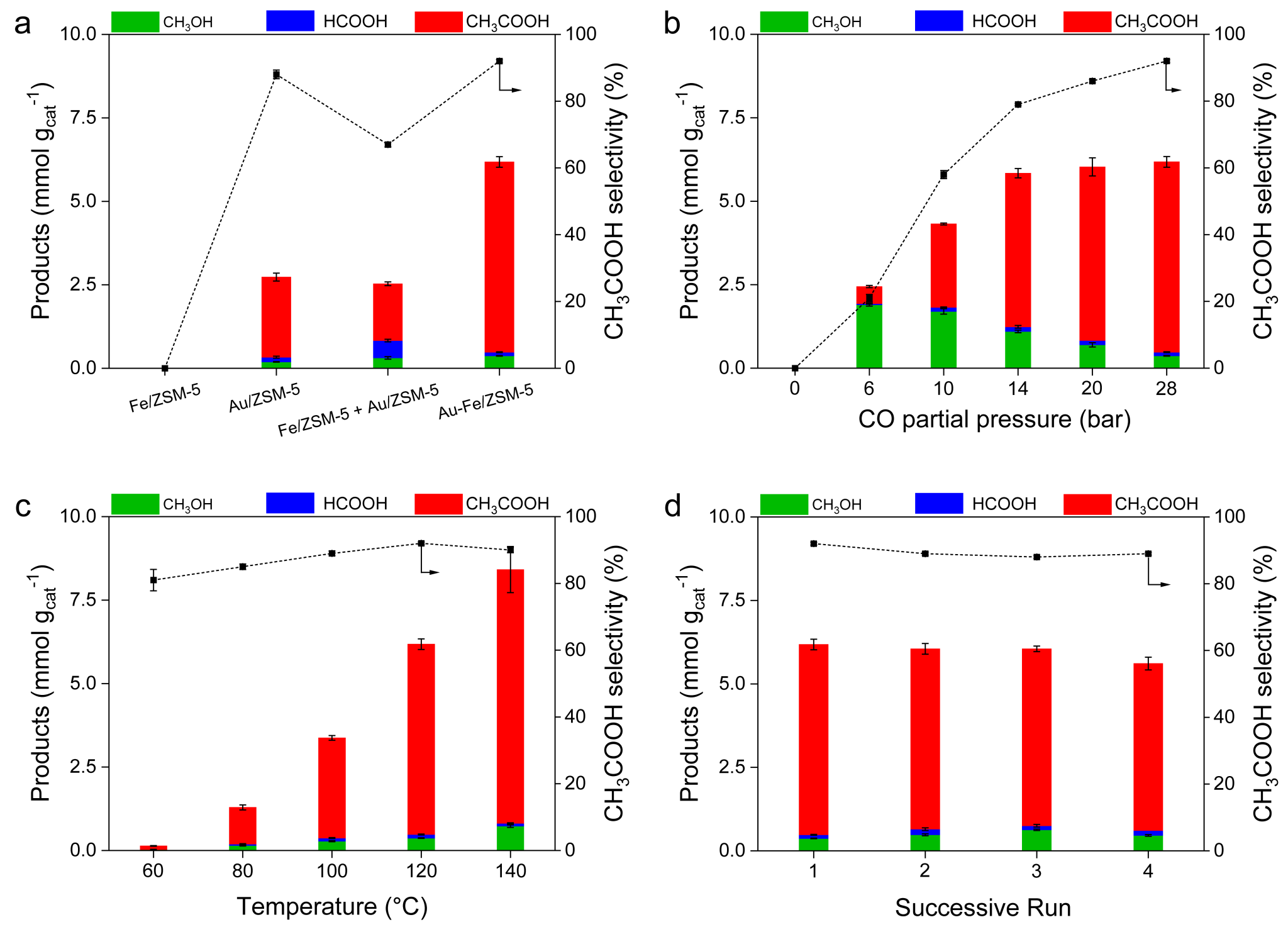 分子筛负载的金-铁双金属催化剂在60到120摄氏度实现了甲烷氧化制乙酸,且该催化剂能够被多次循环使用(图1)。同位素标记实验、捕获实验、分段实验、顺磁共振、高分辨质谱和原位漫反射红外结果表明,一氧化碳在水存在下辅助氧气活化为活性羟基物种。这种随即生成的活性羟基物种介导甲烷氧化并与一氧化碳发生碳-碳偶联生成乙酸(图2)。我们的研究结果不仅提供了一种在低温下将甲烷氧化为乙酸的高效催化剂,还深化了对这一蓬勃发展的研究领域中氧化剂作用的理解。