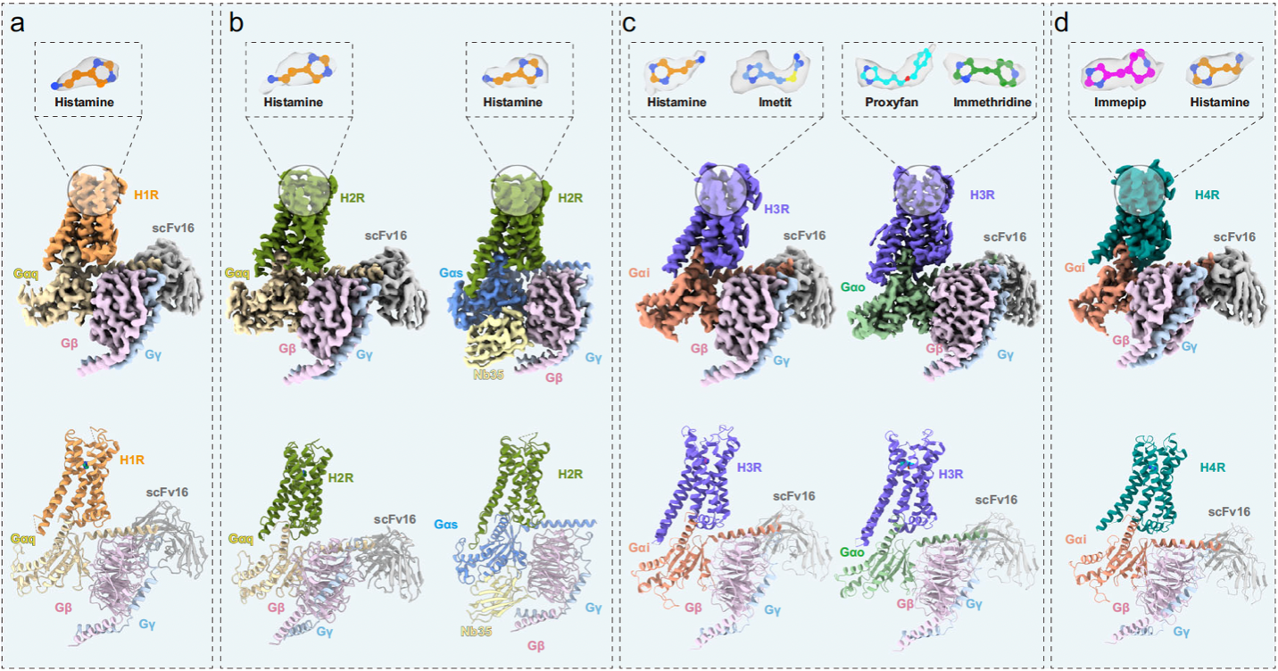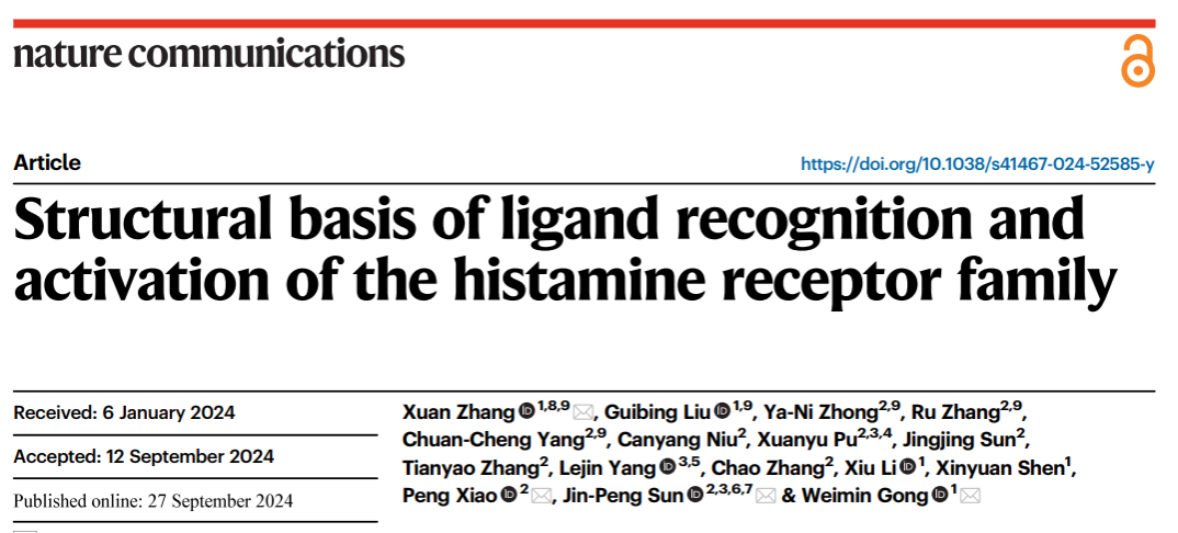 2024年9月27日,qiutantiyu.com龚为民课题组与山东大学孙金鹏课题组合作在Nature Communications杂志在线发表了题为Structural basis of ligand recognition andactivation of the histamine receptor family的研究论文,系统报道了在内源性组胺或其他合成配体存在下,四种组胺家族受体亚型与四种不同的下游 G 蛋白复合的九种低温电子显微镜 (cryo-EM) 结构。该研究为理解所有四种组胺受体的配体识别和 G 蛋白偶联提供了一个结构框架,这可能有助于合理设计针对这些受体的配体。